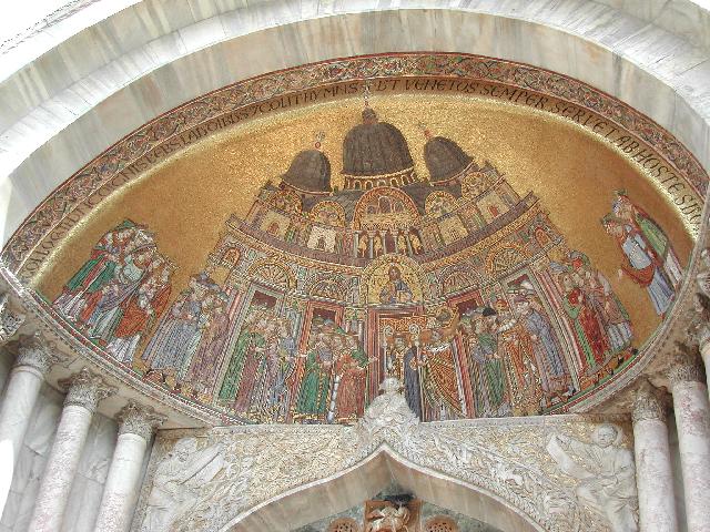 Diese Mosaik an der Außenseite ist das einzige aus dem ursprünglichen Programm. Es zeigt die Überführung der Gebeine des hl. Markus in den Dom. Der Sarg wird unteranderem von einem Bischof getragen. Rechts kann man einen Dogen sehen. Dises Mosaik ist zugleich auch das einzige Bild, das den ursprünglichen Dom ohne die gotischen Ergänzungen des 13. und 14. Jh. zeigt.